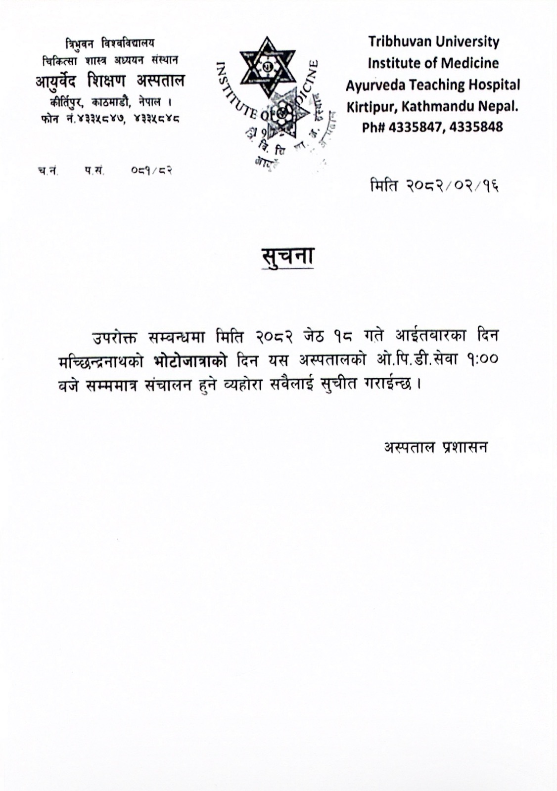 उपरोक्त सम्बन्धमा मिति २०८२ जेठ १८ गते आईतवारका दिन मच्छिन्द्रनाथको भोटोजात्राको दिन यस अस्पतालको ओ.पि.डी. सेवा १:०० वजे सम्ममात्र संचालन हुने व्यहोरा सवैलाई सुचीत गराईन्छ । अस्पताल प्रशासन