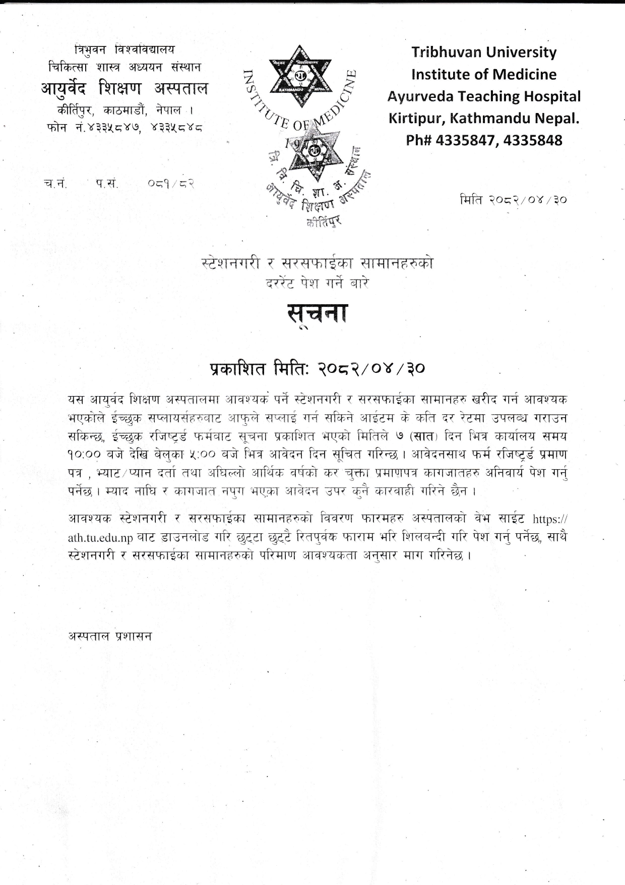 यस आयुर्बेद शिक्षण अस्पतालमा आवश्यक पर्ने स्टेशनगरी र सरसफाईका सामानहरु खरीद गर्न आवश्यक भएकोले ईच्छुक सप्लायर्सहरुबाट आफुले सप्लाई गर्न सकिने आईटम के कति दर रेटमा उपलब्ध गराउन सकिन्छ, ईच्छुक रजिष्टर्ड फर्मवाट सूचना प्रकाशित भएको मितिले ७ (सात) दिन भित्र कार्यालय समय १०:०० बजे देखि बेलुका ५:०० बजे भित्र आवेदन दिन सूचित गरिन्छ । आवेदनसाथ फर्म रजिष्ट्रर्ड प्रमाण पत्र, भ्याट/प्यान दर्ता तथा अघिल्लो आर्थिक वर्षको कर चुक्ता प्रमाणपत्र कागजातहरु अनिवार्य पेश गर्नु पर्नेछ । म्याद नाघि र कागजात नपुग भएका आवेदन उपर कुनै कारवाही गरिने छैन ।